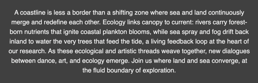Currents of Kinship turns toward the sea, testing how fieldwork, embodied attention, and transdisciplinary exchange might reshape how we sense and relate to coastal ecologies. We welcome professional artists across generations and disciplines (performance, choreography, sound, moving image, writing, visual art, hybrid research practices), anyone drawn to working with shorelines as living, shifting conditions.