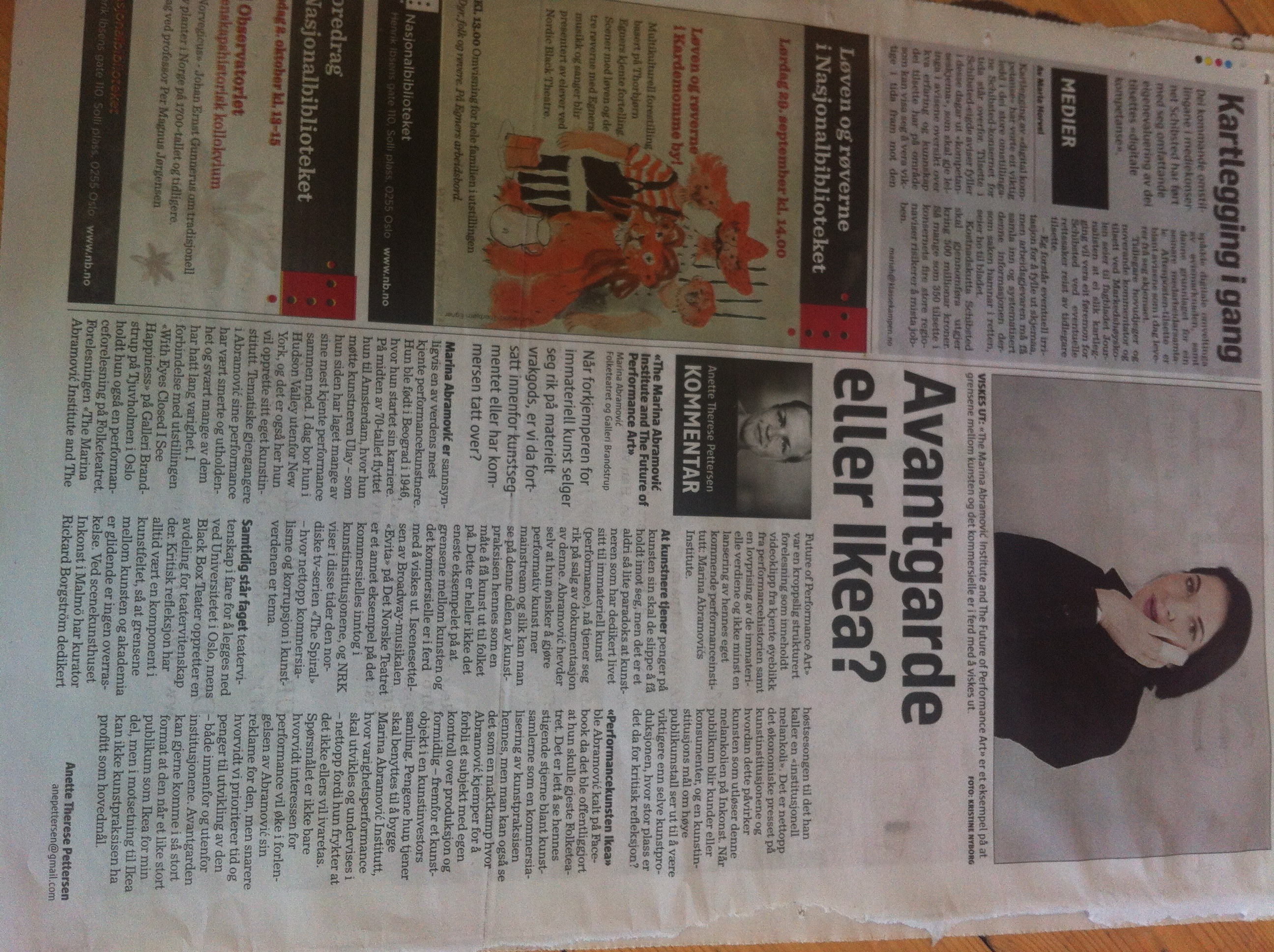 Teaterkritiker Anette Therese Pettersen skriver om Marina Abramovic, Black Box/Oslo och INKONSTs höstprogram i den norska dagstidningen Klassekampen den 2 oktober.