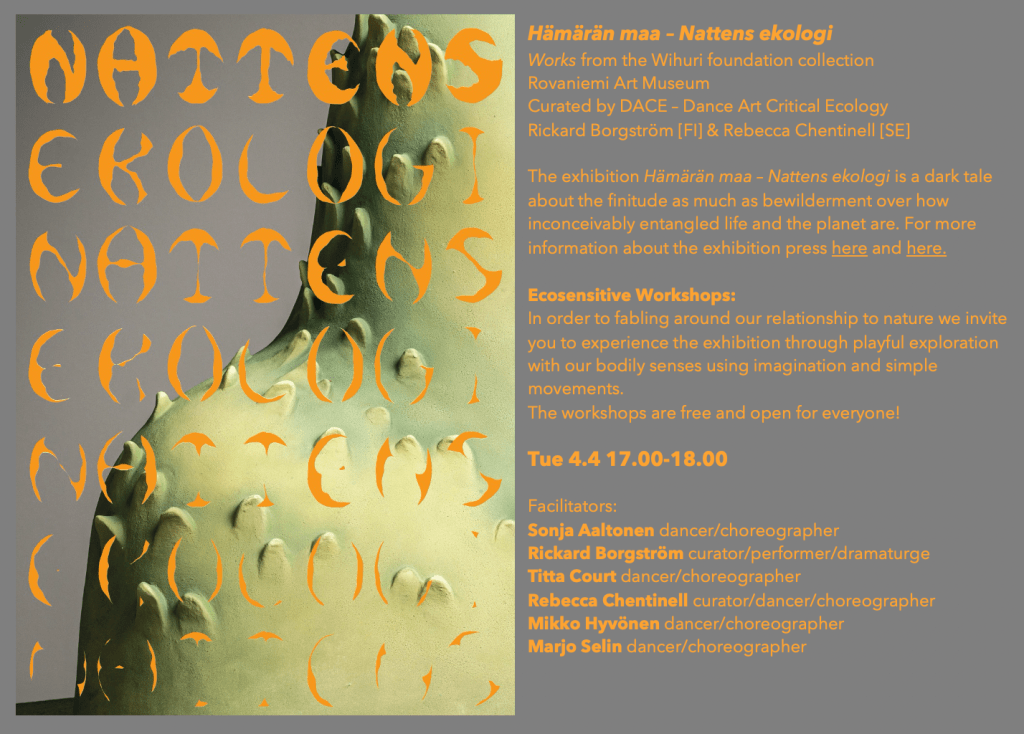 DACE – Dance Art Critical Ecology DACE is a platform for curatorial and choreographic explorations on dance and choreography in a More-than-Human World, initiated by Rickard Borgström and Rebecca Chentinell in 2019. Central to the duo is how the body functions as an interface towards the surroundings. Consequently, they invite artists who engage in the rapid technological, environmental and political changes, with a multitude of bodily approaches, and how this might affect our actions, thinking and artistic practice.