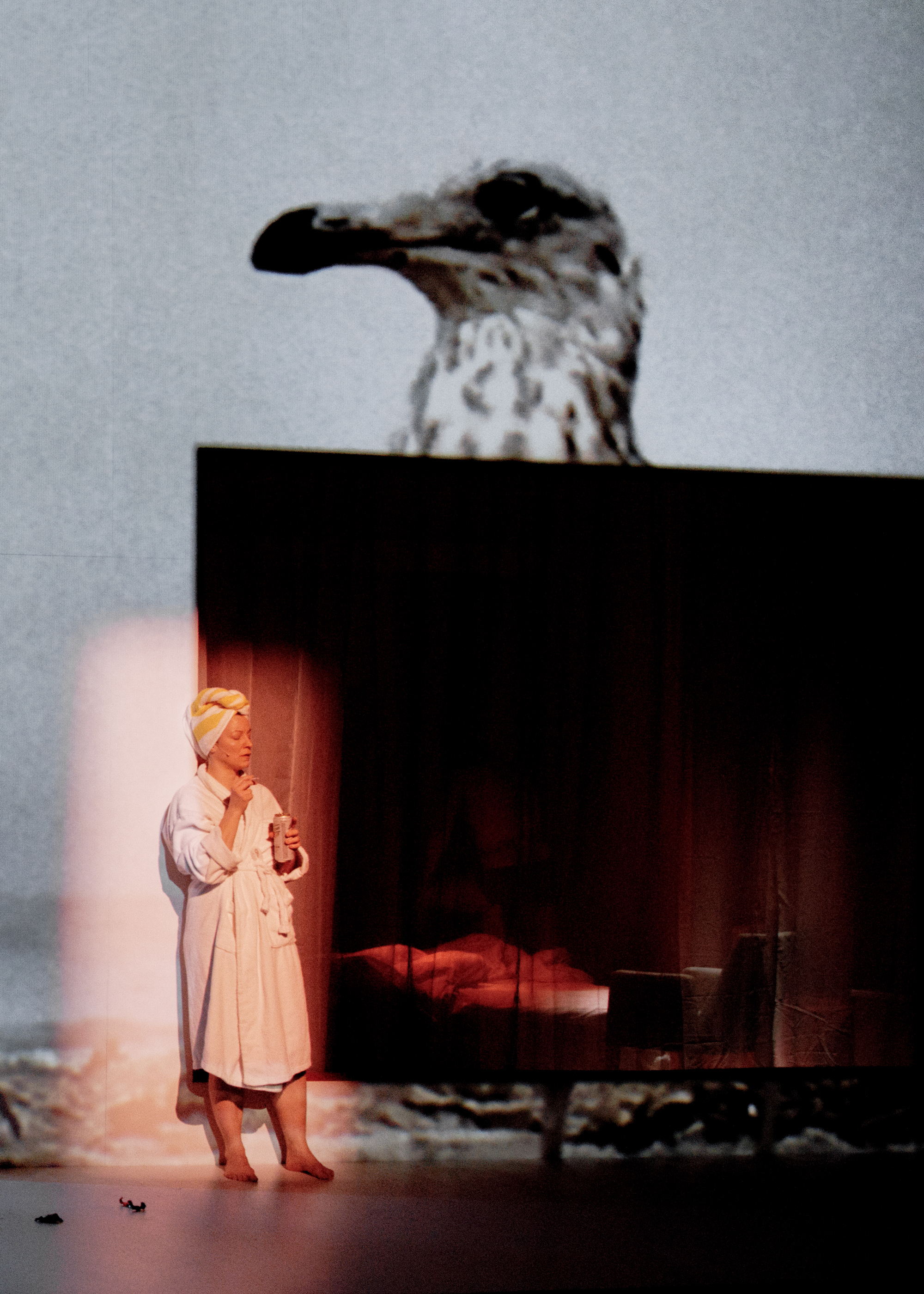 Videodesigner Teemu Nurmelin leker med skalan, genom uppblåsta närbilder av måsarna, som om de ser ner och betraktar aktörerna och publiken, eller avlägsna havshorisonter för att skapa avstånd. Spelet mellan scenografins öppningar och videoprojektionerna ger djup och närhet till scenrummet och det föreställda strandlandskapet.
