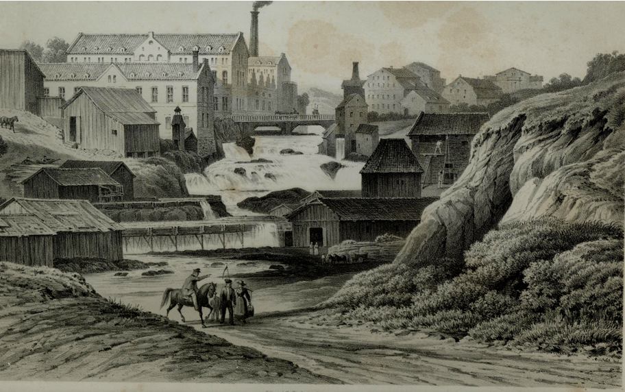 3. IMAGE TEXT Motif from the Akerselva River. Lithograph by A Nay of the original by F Loos from 1857. Owner: Oslo Museum.